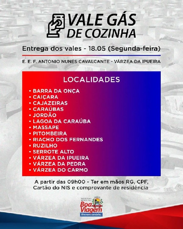As entregas do vale gás de cozinha, primeiro lote, irão ocorrer nas escolas selecionadas da zona rural e sede, no horário da manhã, a partir das 9H.